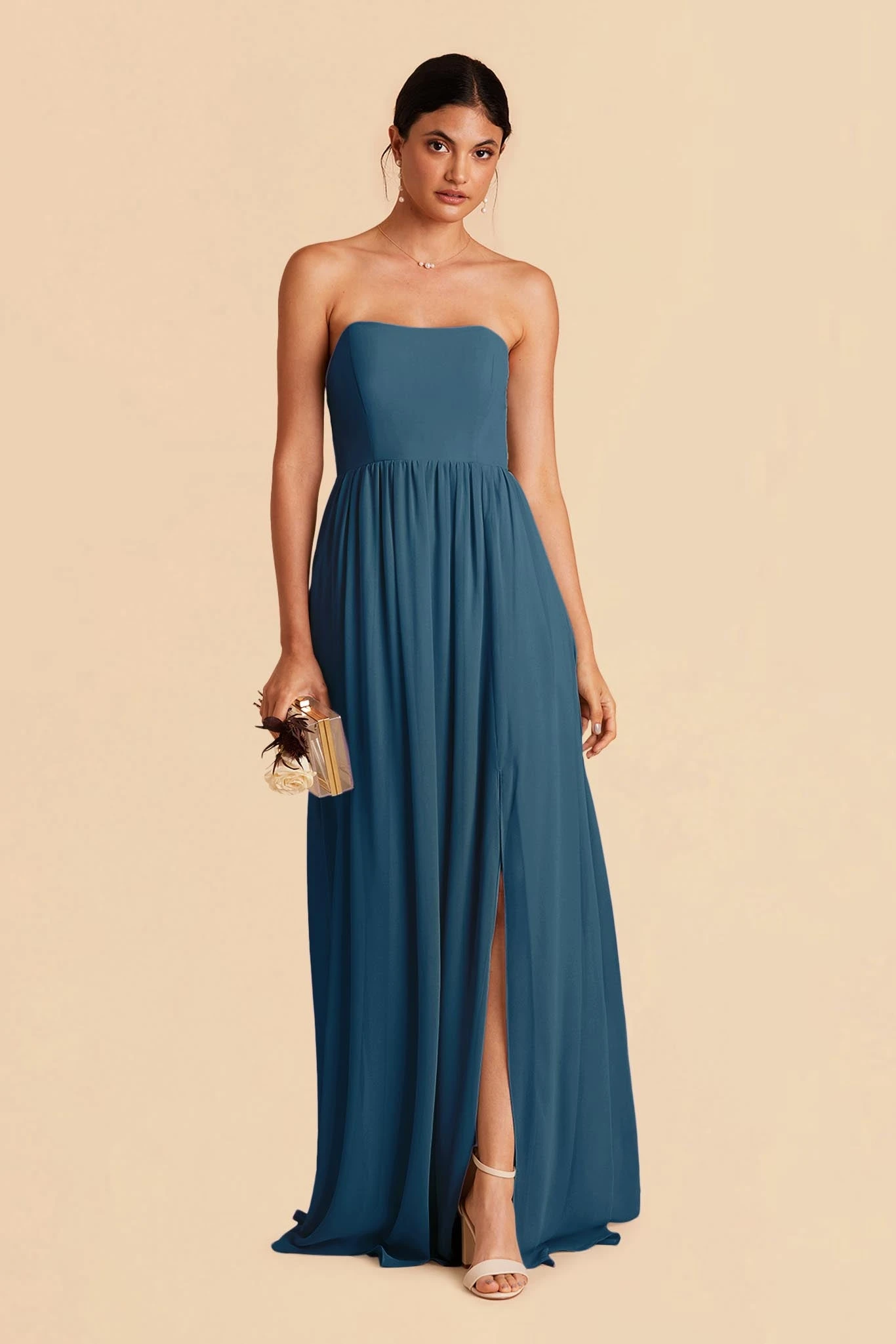 Less is absolutely more with this ultra-simple convertible dress. August features a straight neckline with removable straps. The bodice has boning for added structure and support. You can keep the straps on, remove it completely, or attach draped sleeves for an off-the-shoulder look.