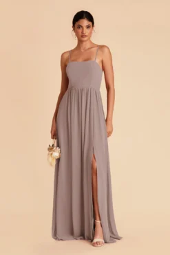 Less is absolutely more with this ultra-simple convertible dress. August features a straight neckline with removable straps. The bodice has boning for added structure and support. You can keep the straps on, remove it completely, or attach draped sleeves for an off-the-shoulder look.