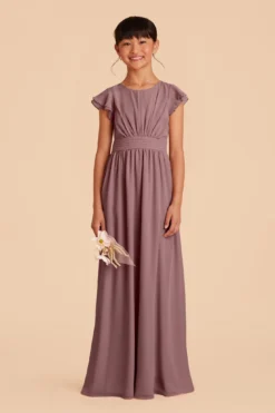This sweet ruffle-sleeved dress is a dream for a junior bridesmaid. This design features a waistband tie in back for juniors who are between sizes.