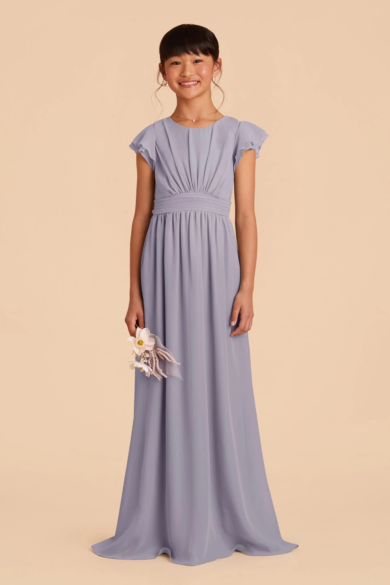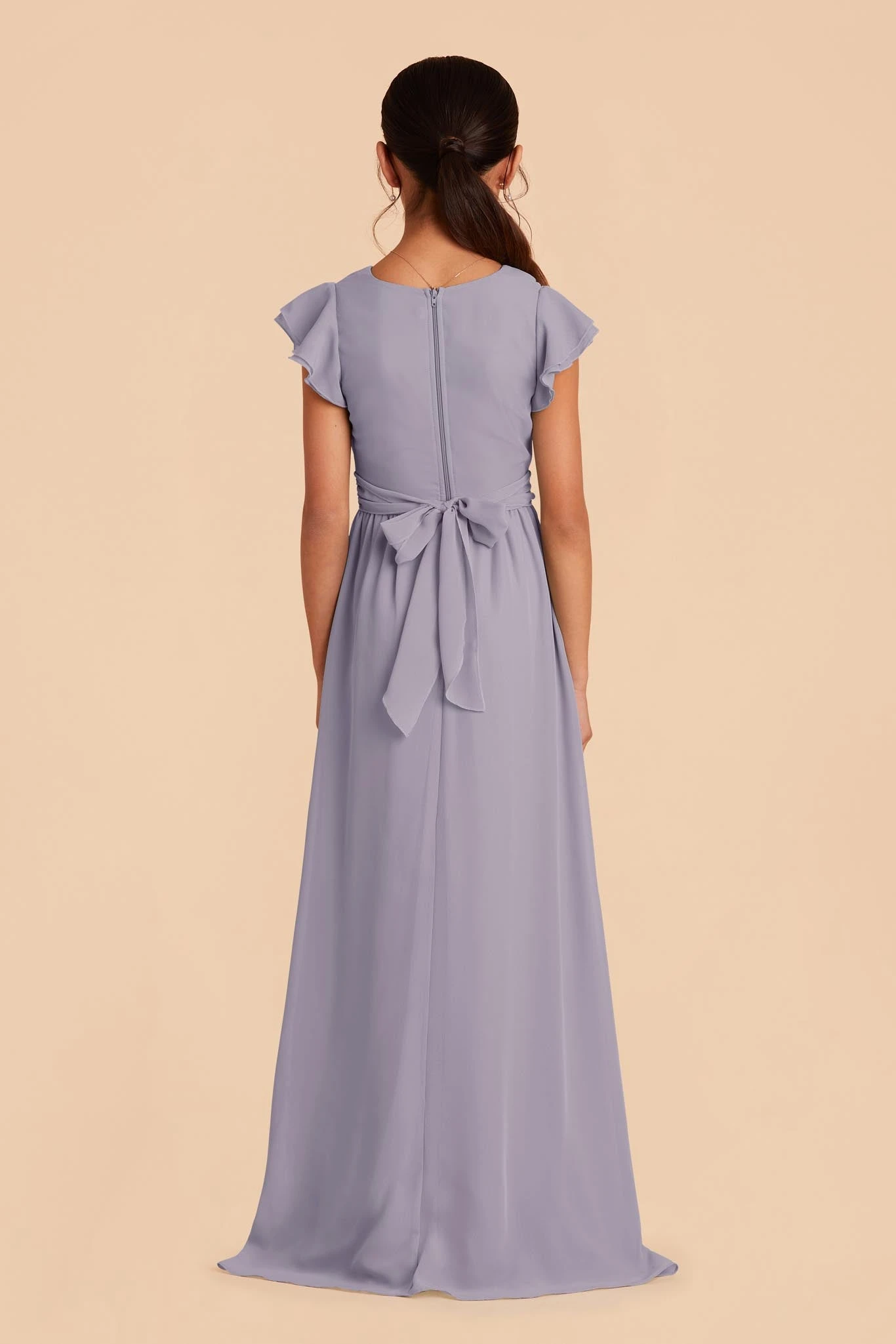 This sweet ruffle-sleeved dress is a dream for a junior bridesmaid. This design features a waistband tie in back for juniors who are between sizes.