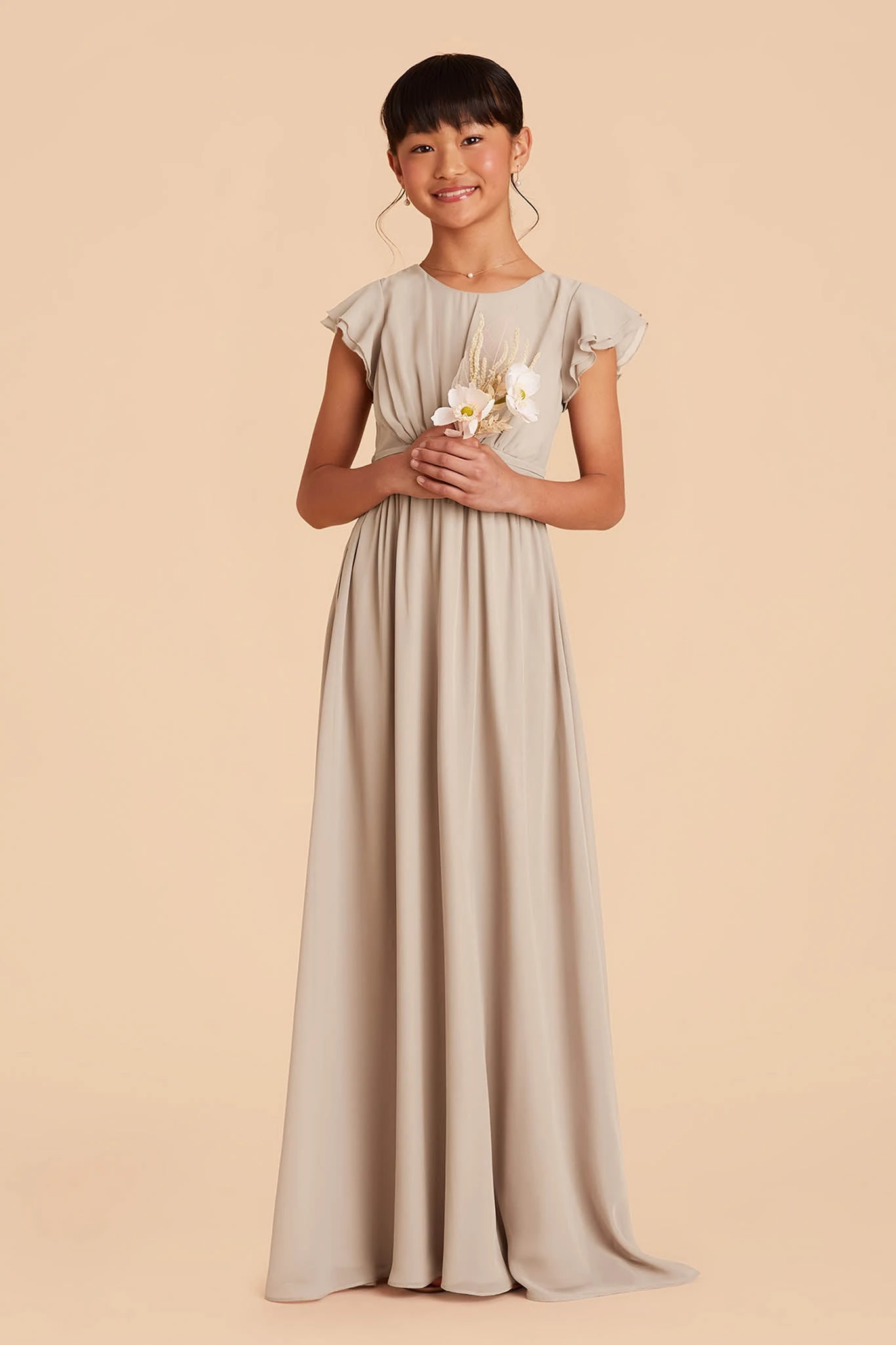 This sweet ruffle-sleeved dress is a dream for a junior bridesmaid. This design features a waistband tie in back for juniors who are between sizes.