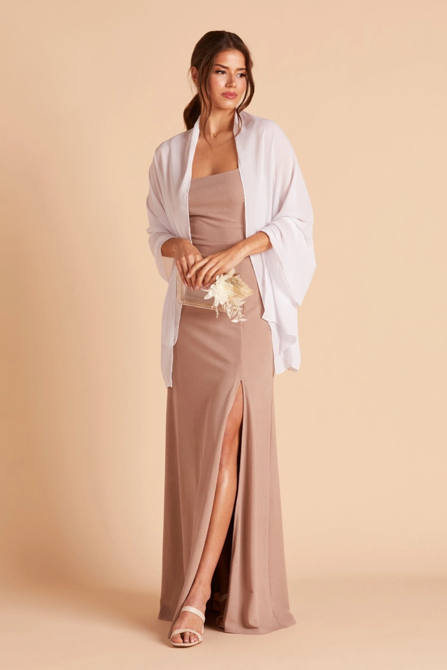 A dreamy match to our chiffon dresses and finishing touch to your spring and fall wedding look, this lightweight chiffon wrap in white adds just the right amount of coverage to our bridesmaid dress collection. Throw it over your shoulders if there’s a light breeze, and get ready to toss it over your chair when it’s time to warm up and hit the dance floor!