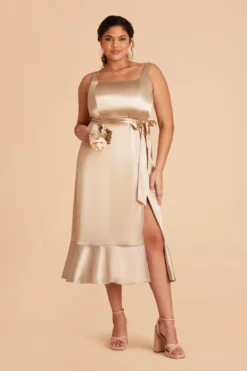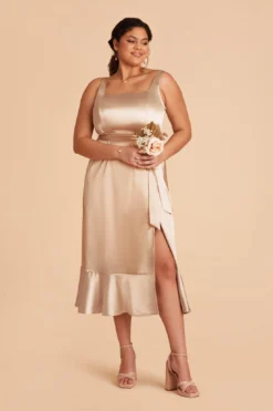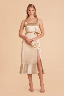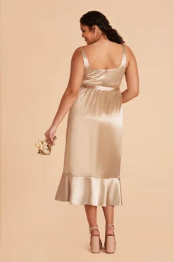 Eugenia Shiny Satin Convertible Midi Dress – Neutral Champagne
