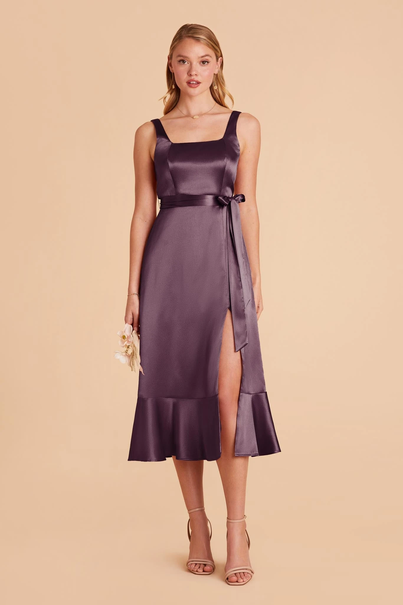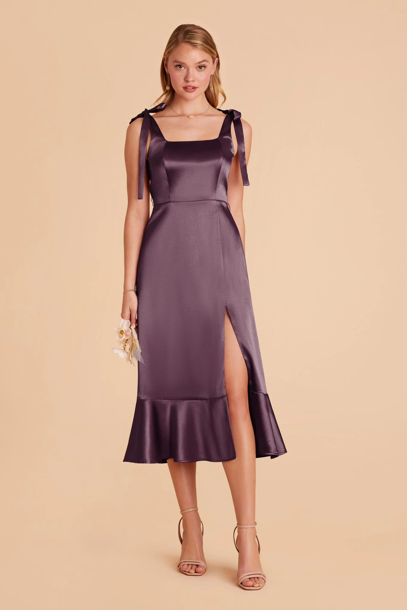 Eugenia Shiny Satin Convertible Midi Dress – Plum