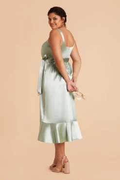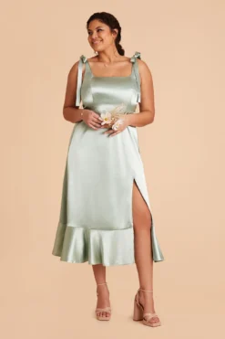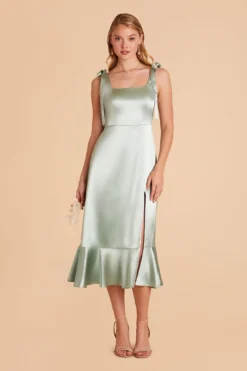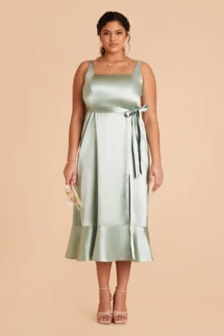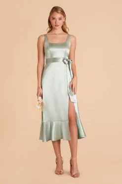 Eugenia Shiny Satin Convertible Midi Dress – Sage