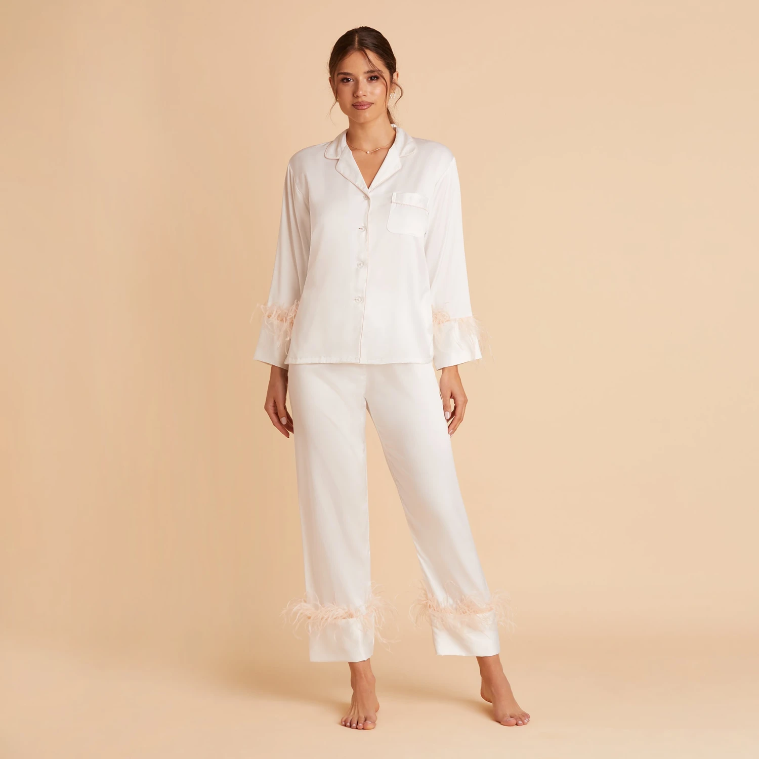 Bridesmaids in feathers flock together. Or at least they’ll all look amazing strutting around the bridal suite, bach weekend or post-rehearsal dinner slumber party in these classic, satin PJs with feather accents. This timeless button-up long sleeve set features the softest woven fabric with a spandex blend for extra stretchy comfort. Get ready for the cutest #bridesbabes pictures ever. Pillow fight not required, but highly recommended.