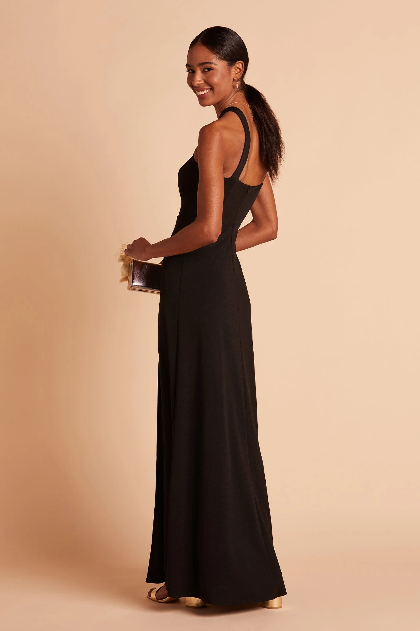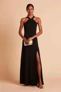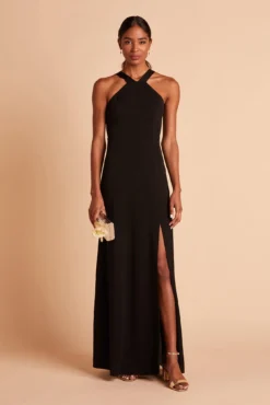A fresh update on the halter look, the Gene crepe bridesmaid dress features an edgy criss-cross halter with flat, wide straps that highlight your shoulders and also brings a bit of the bodycon vibe on top (without it being overly sexy). She’s sleek, seductive, and definitely knows how to party. Pair her with a soft up-do to balance out the modern look while showing off the shoulders, or go for long, loose waves that add a touch of romance.