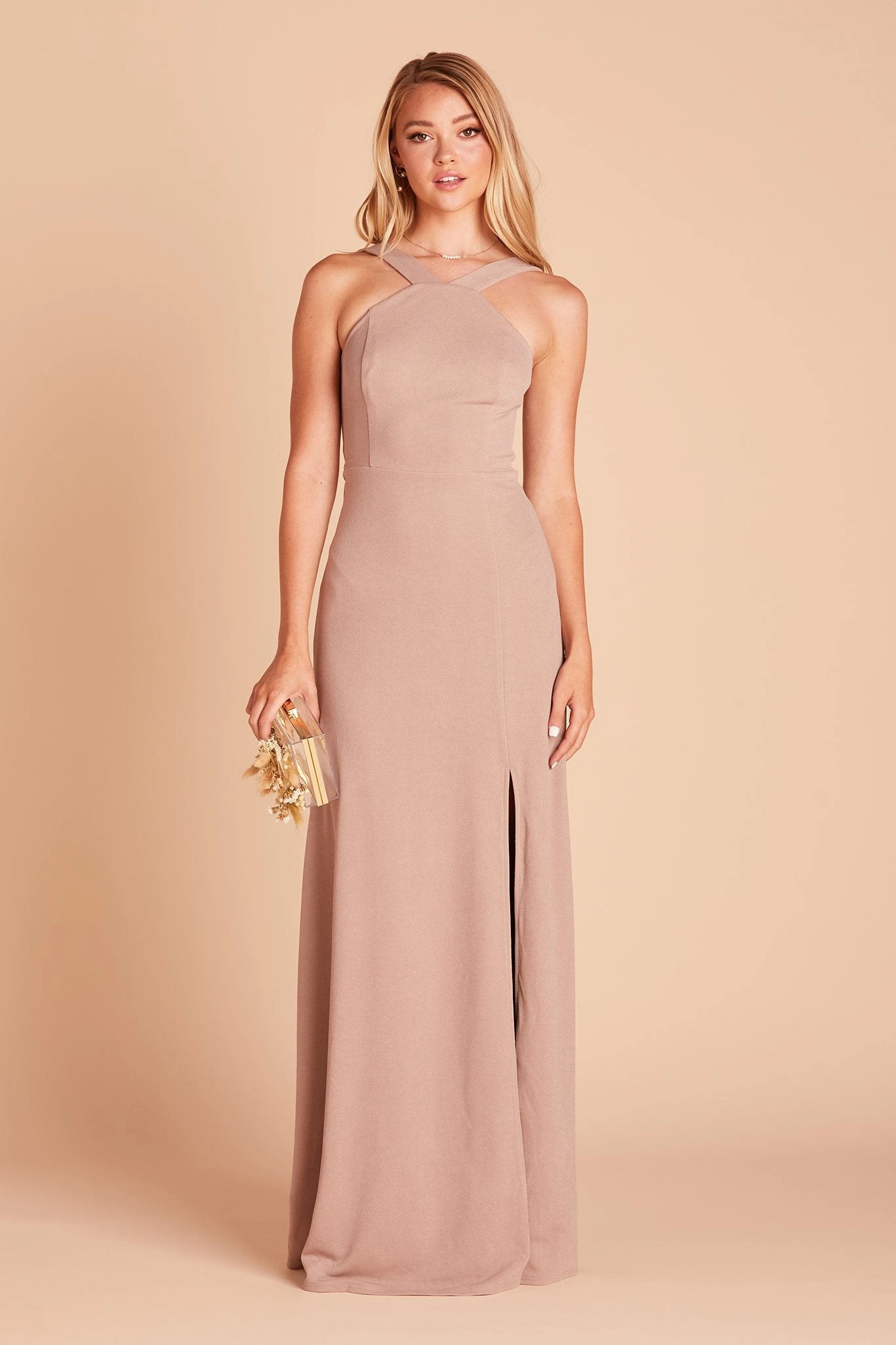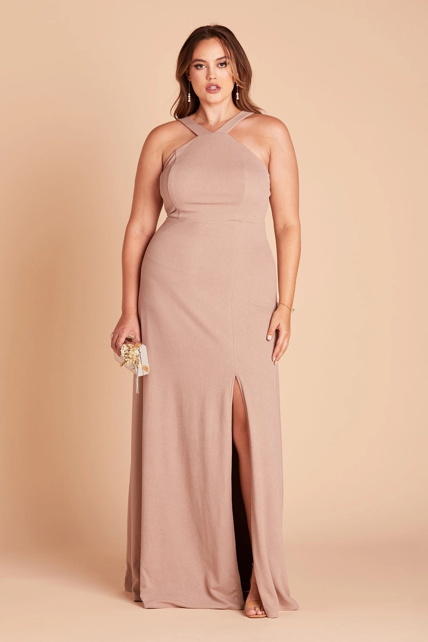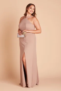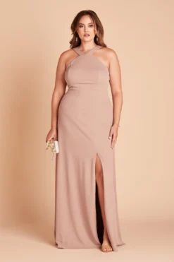 A fresh update on the halter look, the Gene crepe bridesmaid dress features an edgy criss-cross halter with flat, wide straps that highlight your shoulders and also brings a bit of the bodycon vibe on top (without it being overly sexy). She’s sleek, seductive, and definitely knows how to party. Pair her with a soft up-do to balance out the modern look while showing off the shoulders, or go for long, loose waves that add a touch of romance.