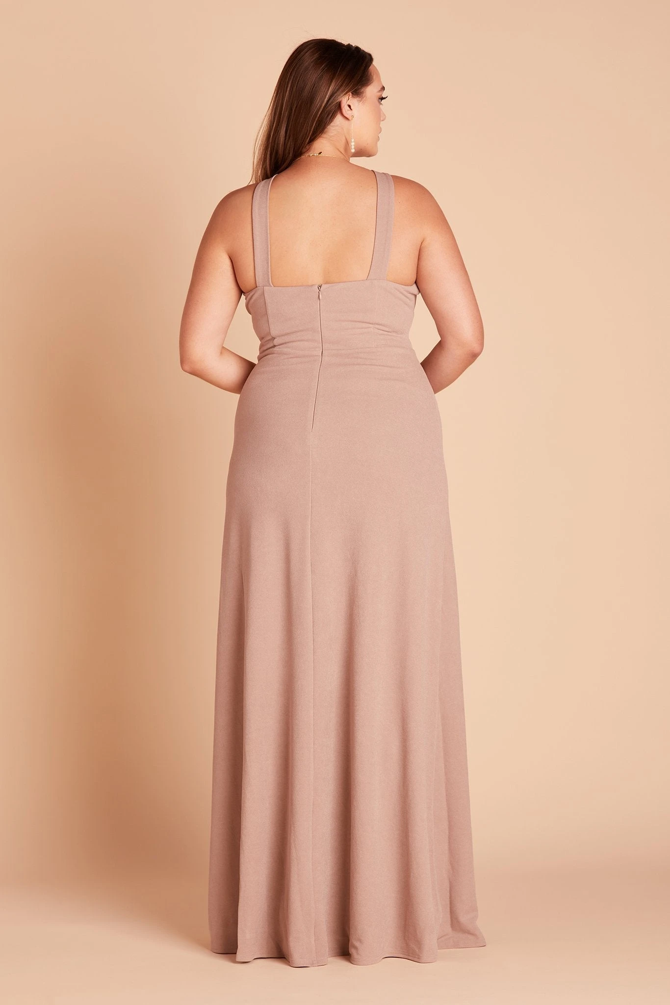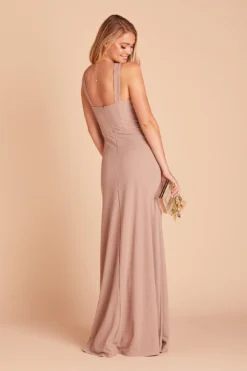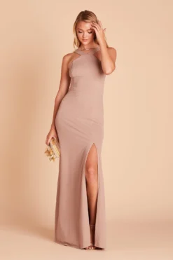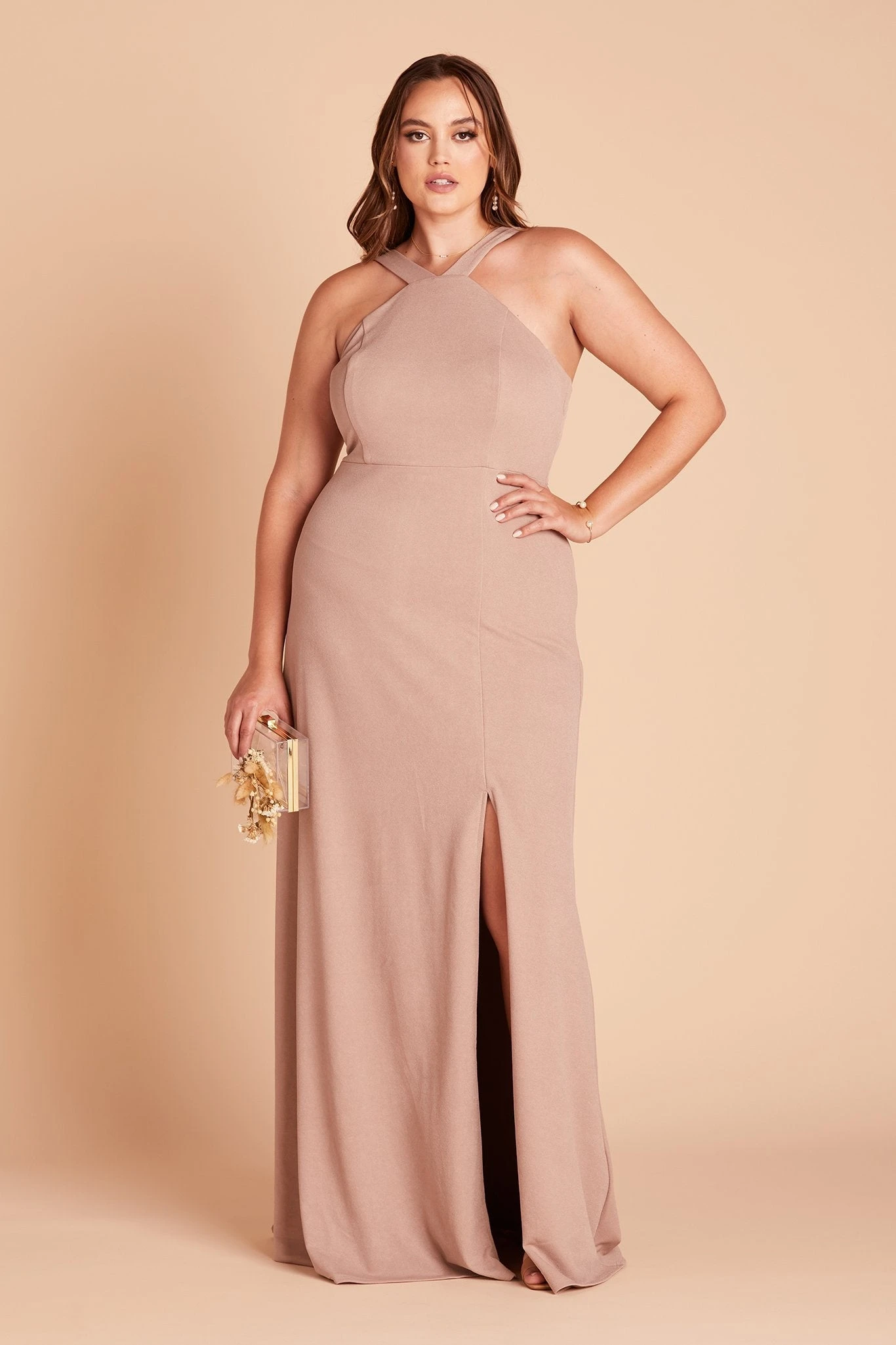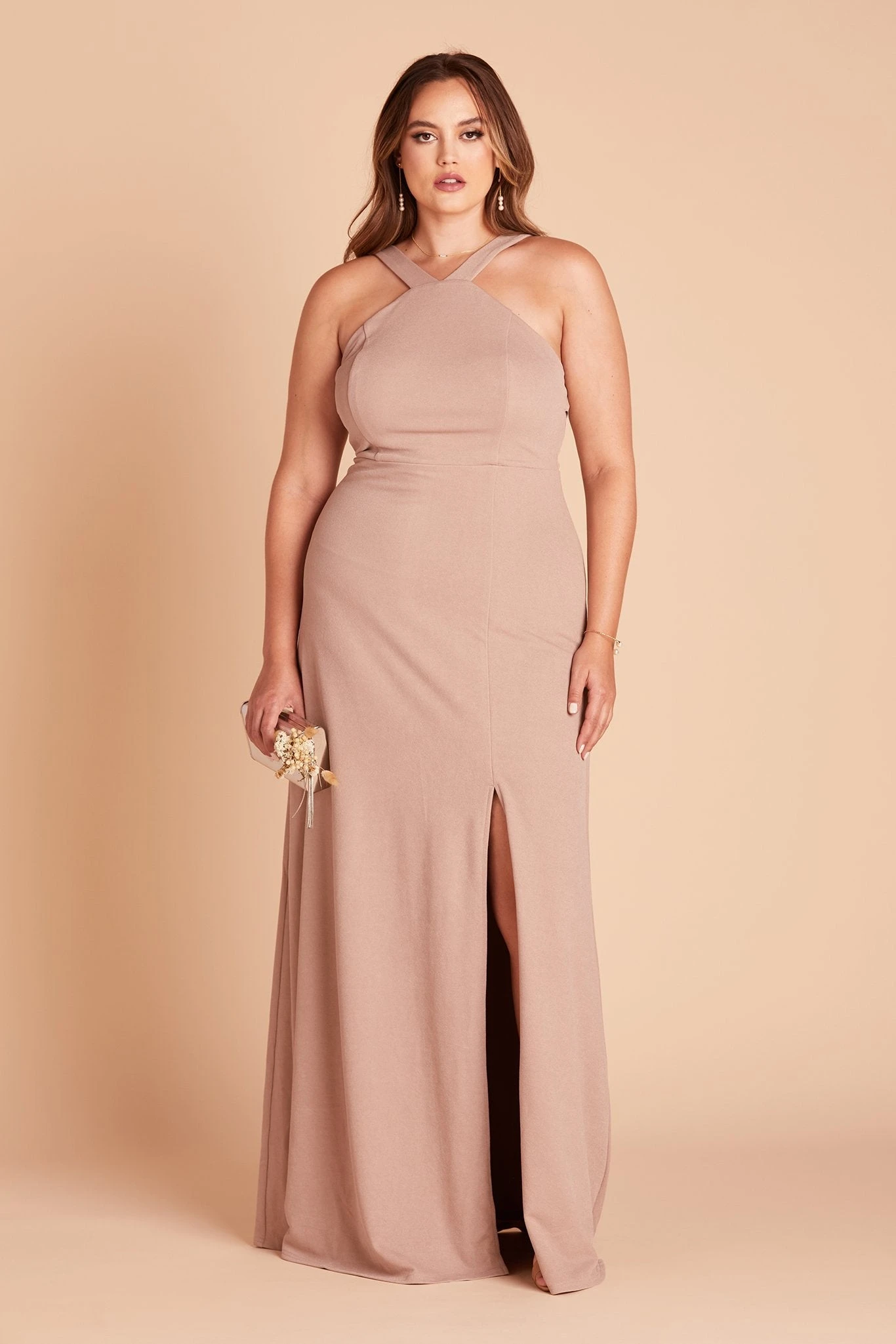 A fresh update on the halter look, the Gene crepe bridesmaid dress features an edgy criss-cross halter with flat, wide straps that highlight your shoulders and also brings a bit of the bodycon vibe on top (without it being overly sexy). She’s sleek, seductive, and definitely knows how to party. Pair her with a soft up-do to balance out the modern look while showing off the shoulders, or go for long, loose waves that add a touch of romance.