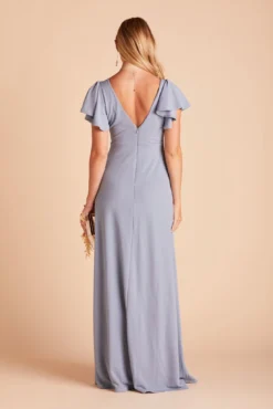 For the girl who loves a little ruffle, we present our Hannah Dress, with an empire waistline and romantic, ruffly sleeves. She features a plunging V front & back, a sexy slit, and a body-skimming silhouette that hugs in all the right places.