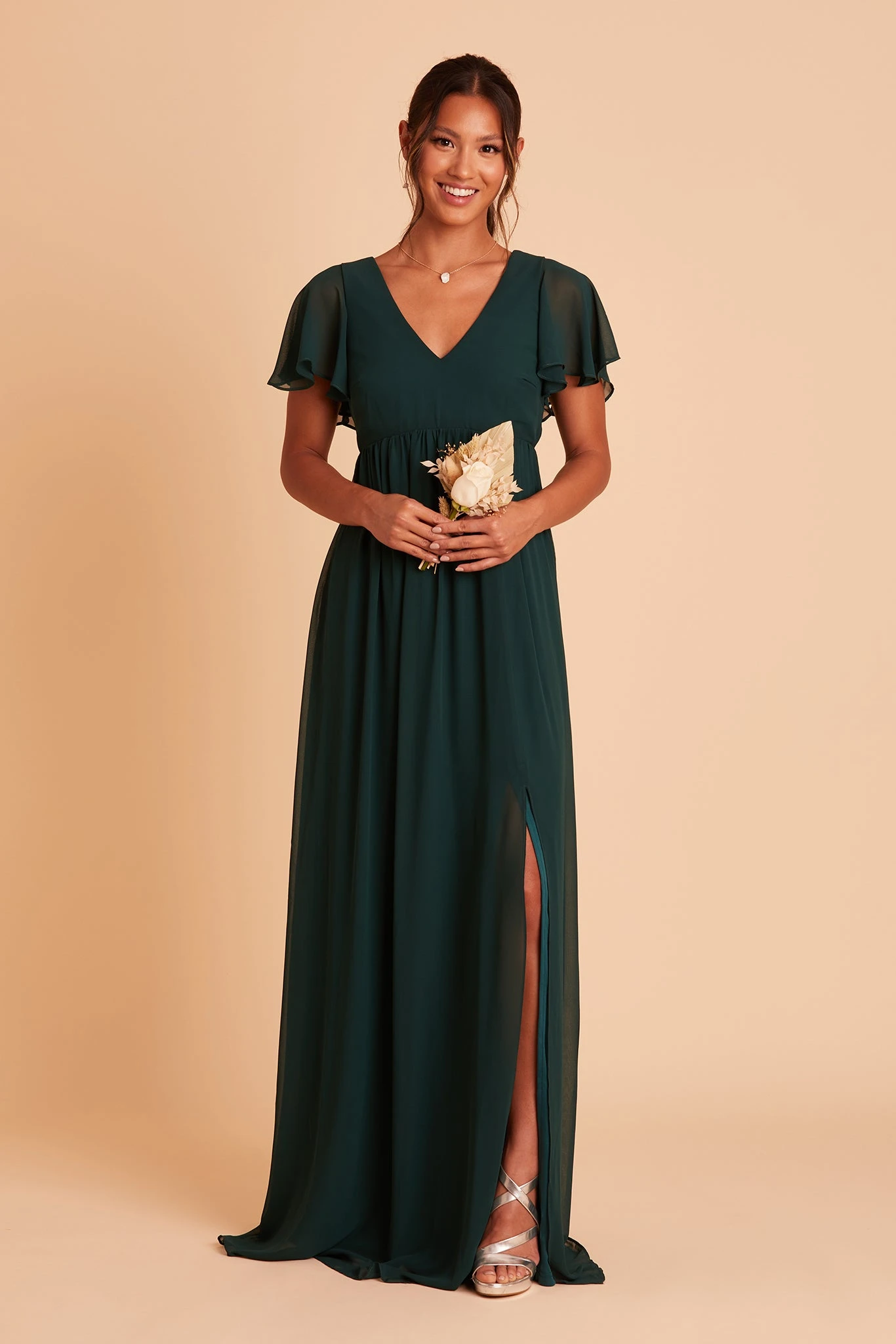 Whatever you need that extra wiggle room for—a baby bump, a second helping, extra cake, or if you simply prefer more breathing room, Hannah is the girl for you. Spun of lightweight chiffon, this dress won’t ever weigh you down while floating down the aisle or getting down on the dancefloor (no one said a bump should keep you from having fun!). The key here is the raised empire waist fitted with a stretchy elastic that’s especially great news for expecting moms. The flutter sleeves add a sweet touch while also offering comfy arm coverage.