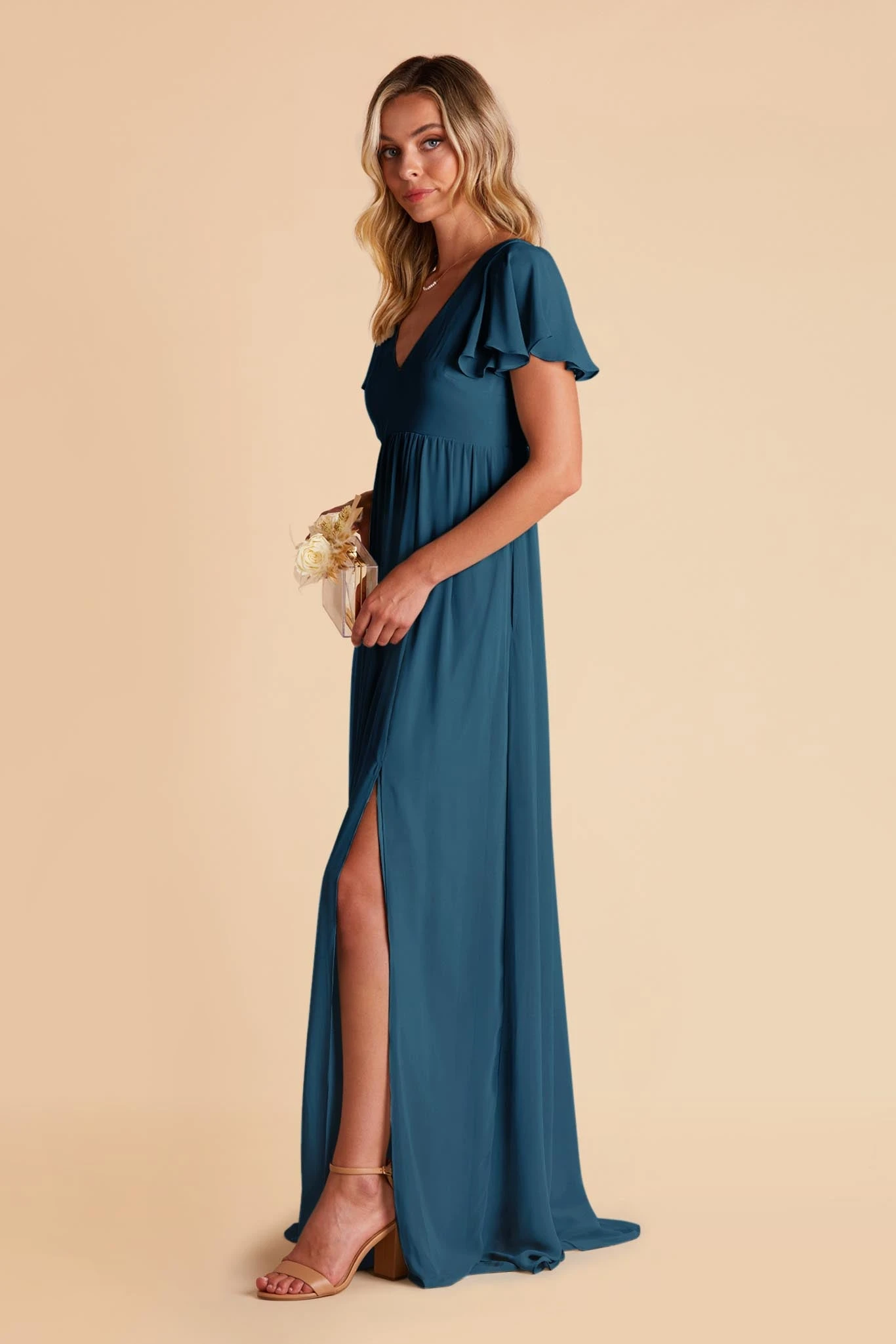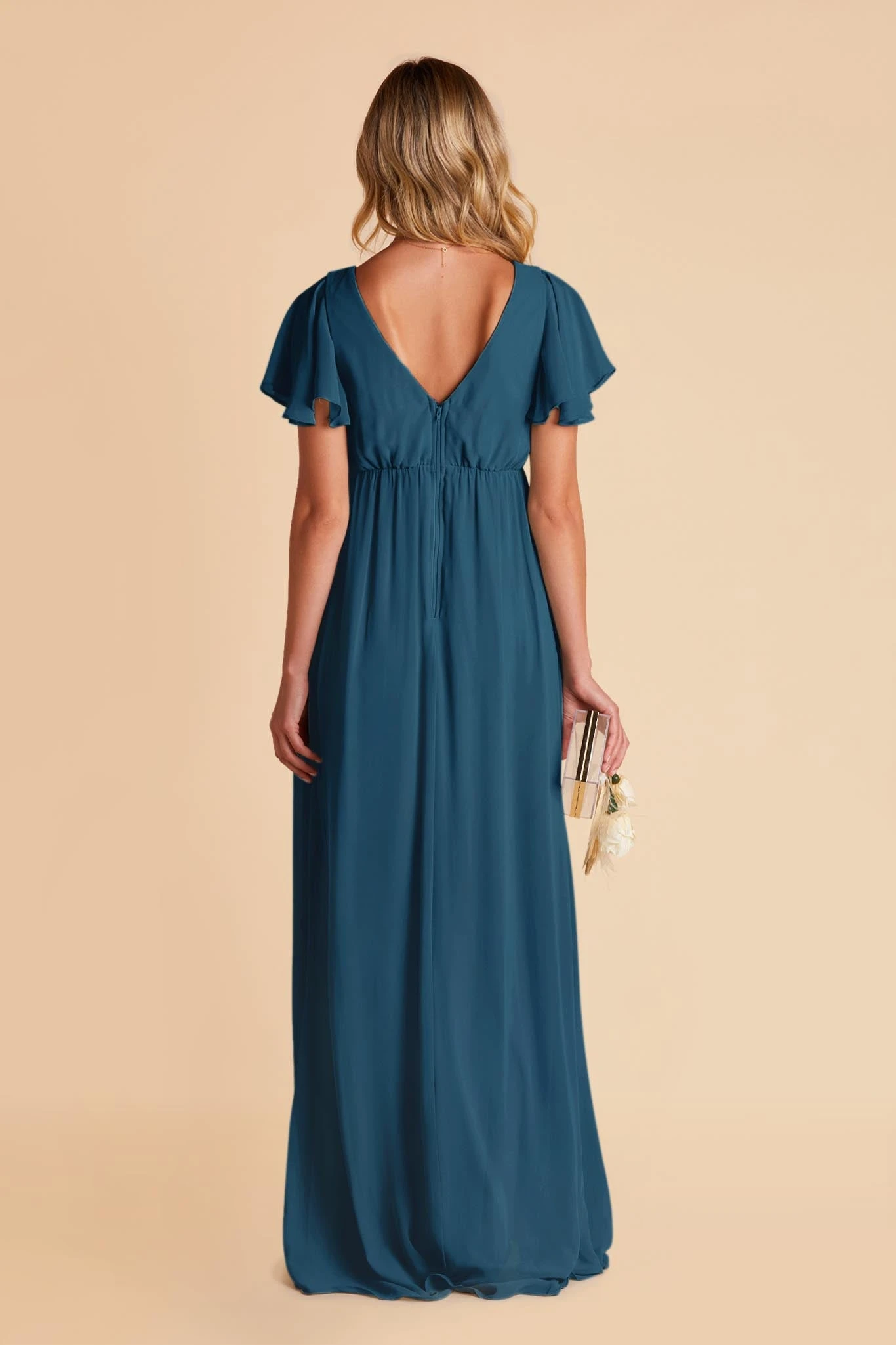 Whatever you need that extra wiggle room for—a baby bump, a second helping, extra cake, or if you simply prefer more breathing room, Hannah is the girl for you. Spun of lightweight chiffon, this dress won’t ever weigh you down while floating down the aisle or getting down on the dancefloor (no one said a bump should keep you from having fun!). The key here is the raised empire waist fitted with a stretchy elastic that’s especially great news for expecting moms. The flutter sleeves add a sweet touch while also offering comfy arm coverage.