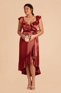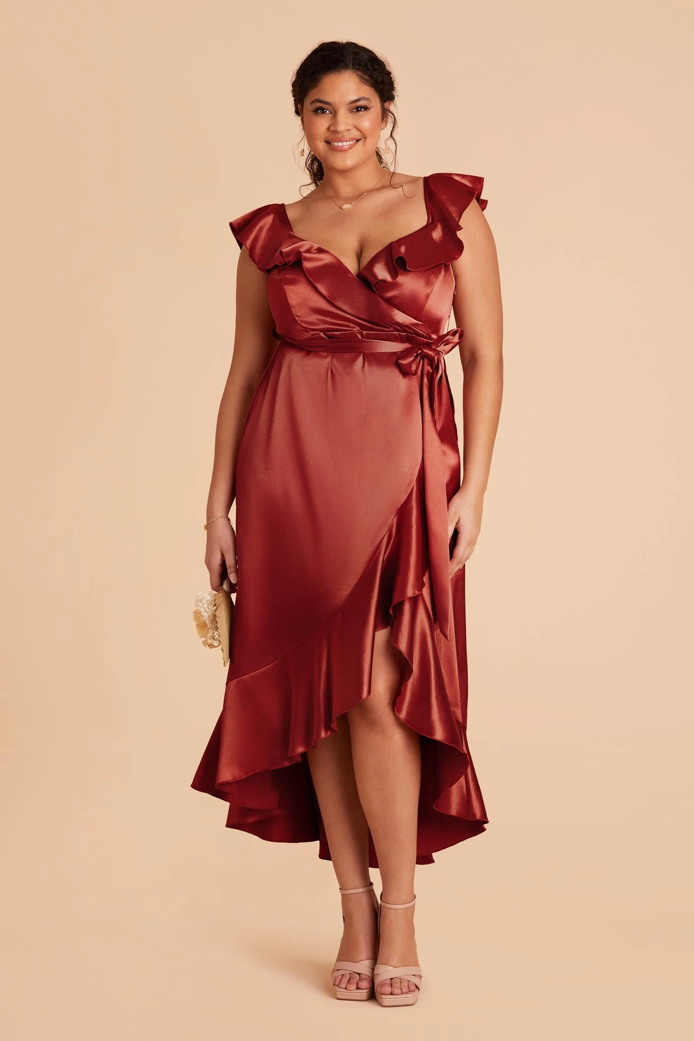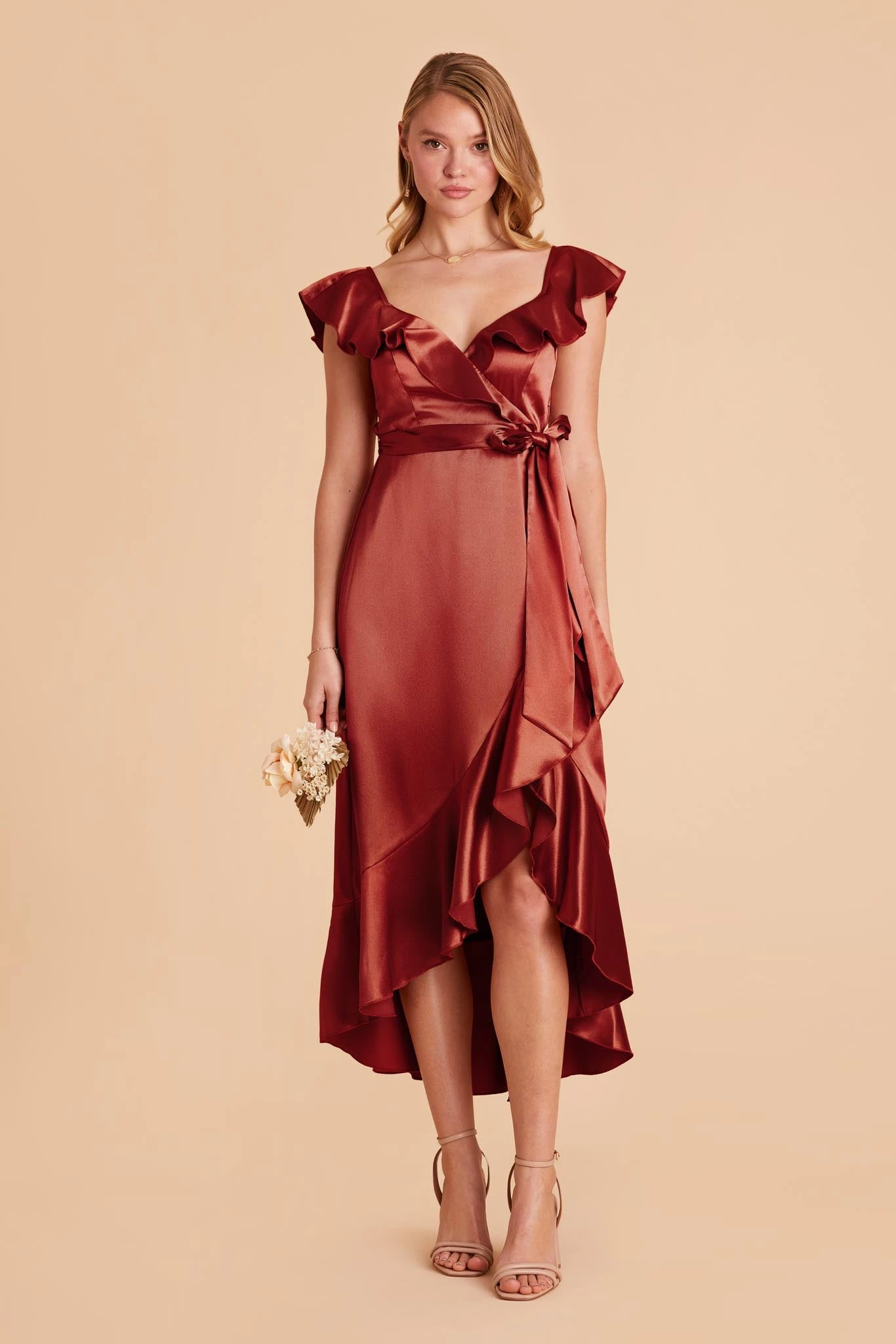 This satin midi bridesmaid dress, with its asymmetrical skirt and cascading ruffles is as romantic as it gets.