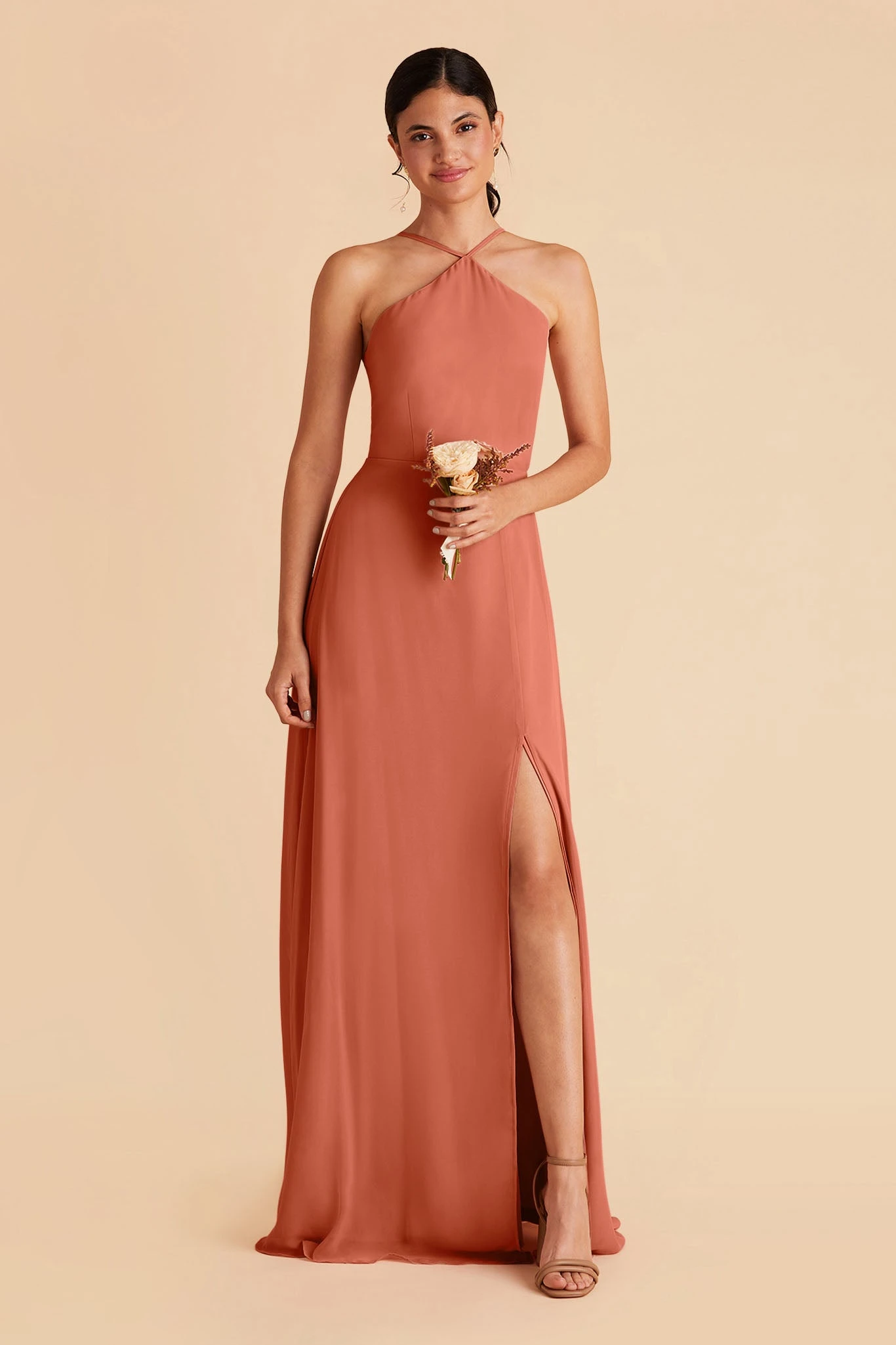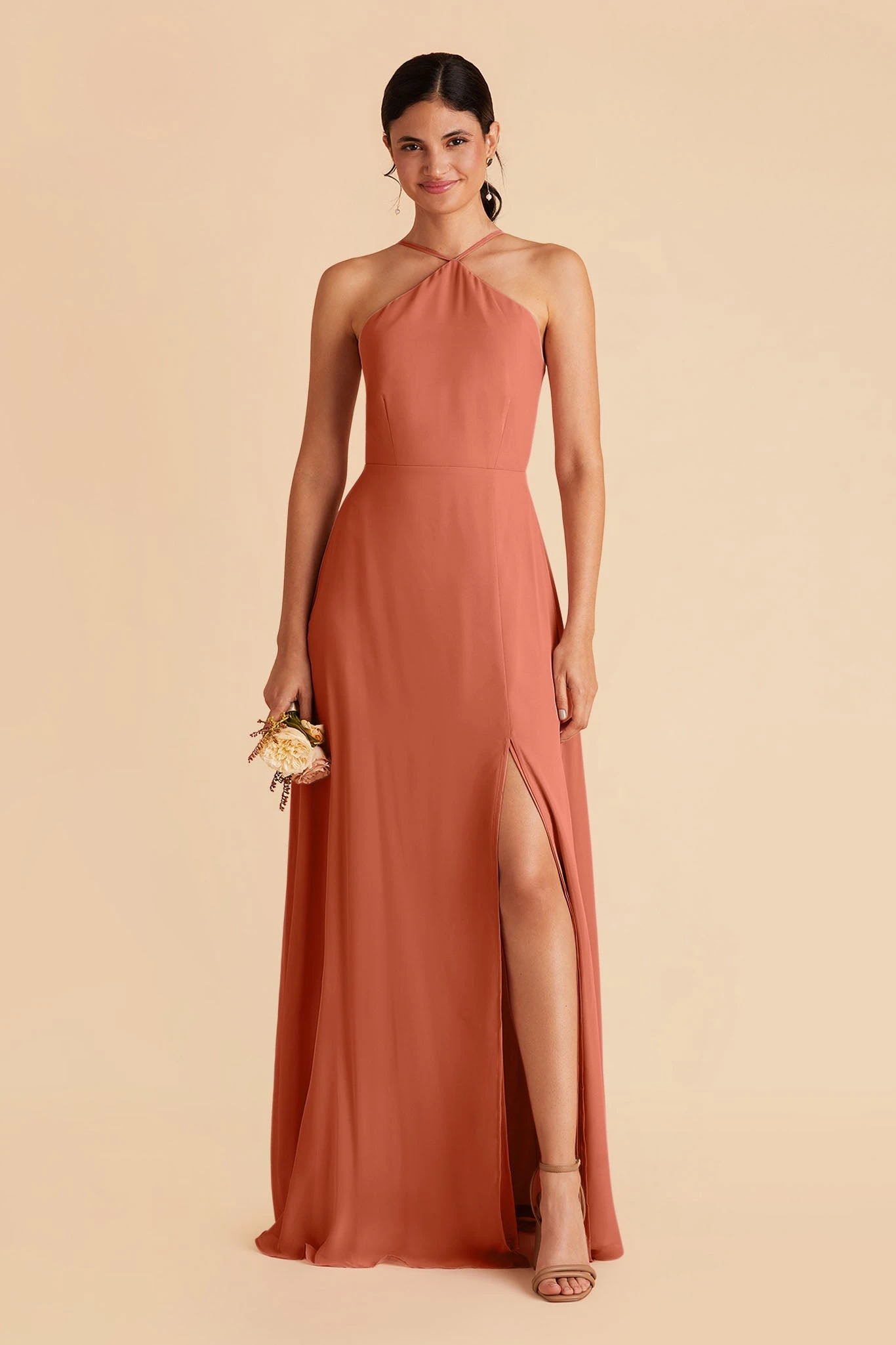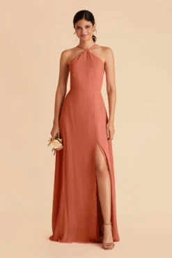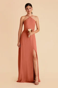 Less is more with this thin-strapped halter bridesmaid dress. Juliet also features a slimmer, more minimal skirt design, that dials up the sleek factor in a big way. She’s perfect for the bridesmaid who’s looking for a simpler design but still wants the elegance of chiffon.