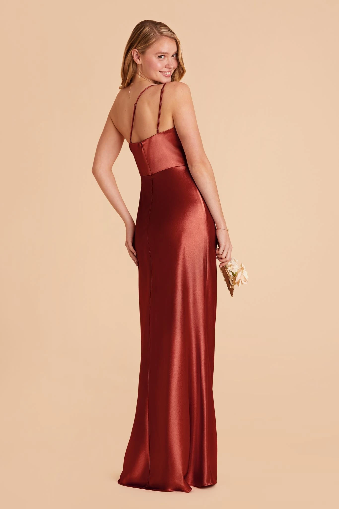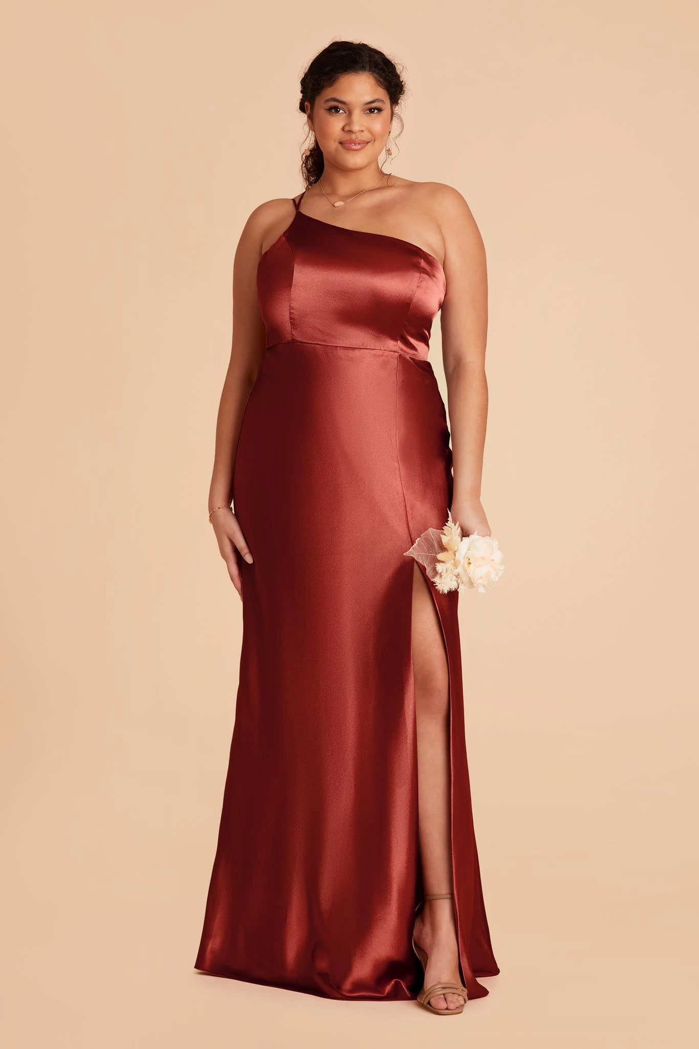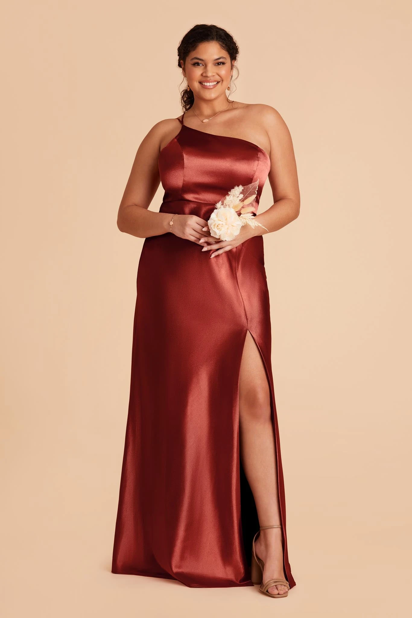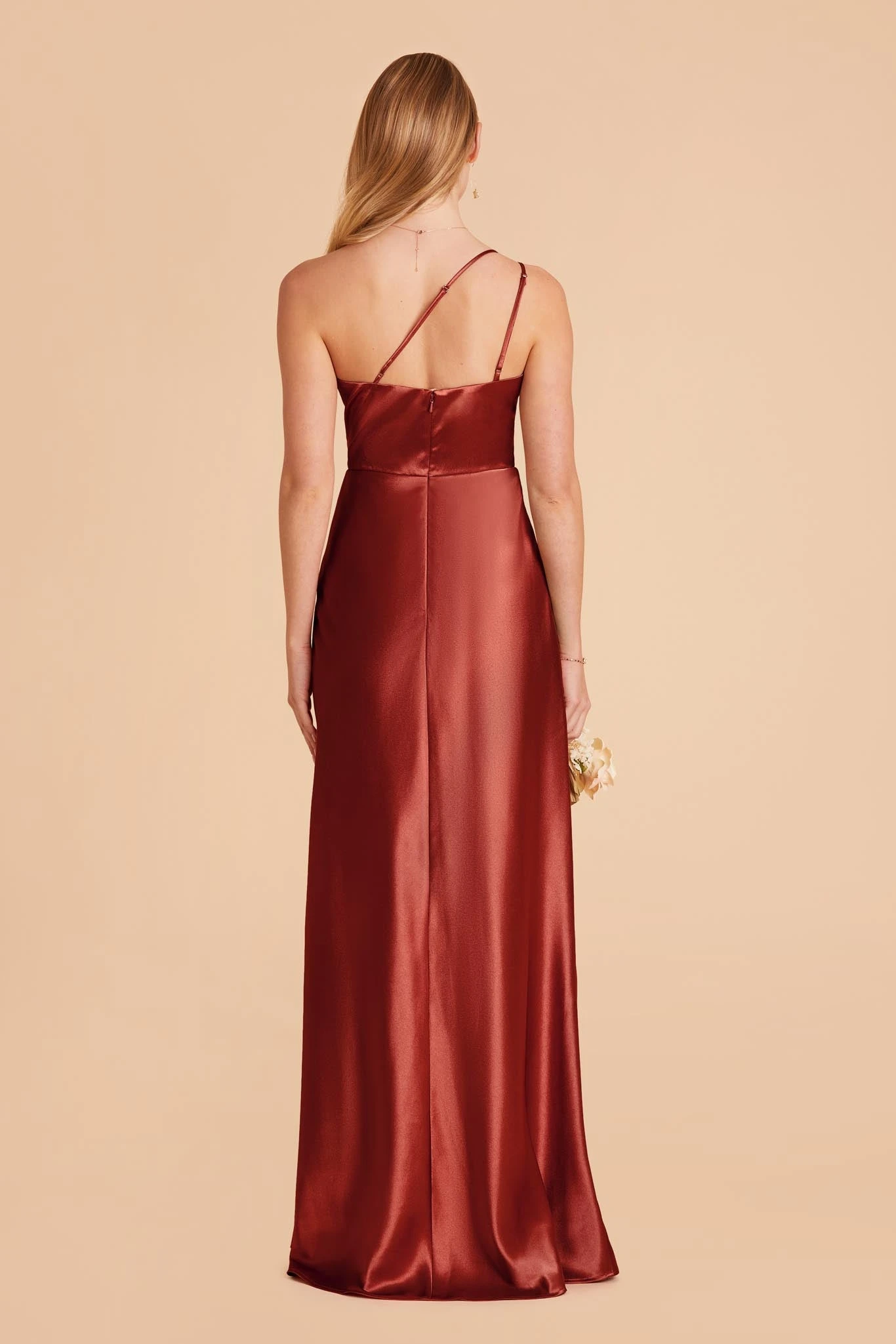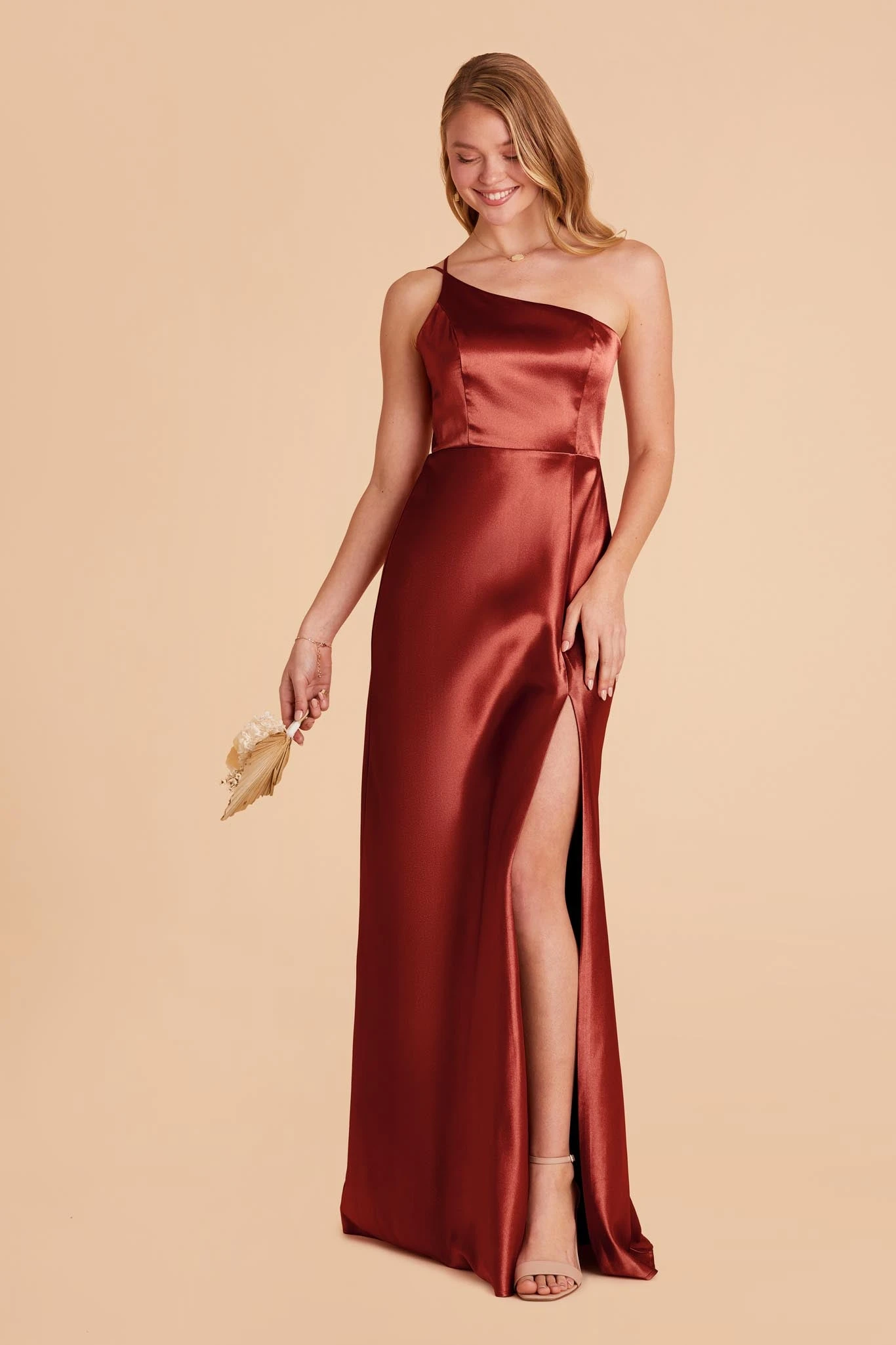 This ultra modern one-shoulder satin bridesmaid dress is the picture of 21st century elegance.
