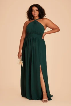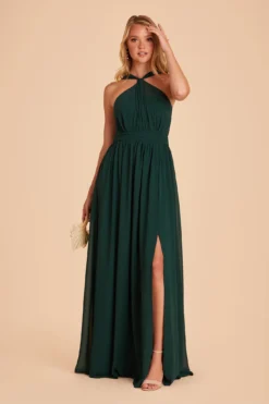 What does every goddess need in order to complete her sleek bridesmaid look? Secret side pockets for stashing her iPhone! This design features a gently ruched high-neck halter silhouette and a sexy slit in the skirt. Kiko in airy chiffon also has built-in bra cups and fits true-to-size.
