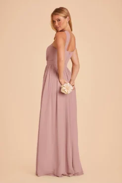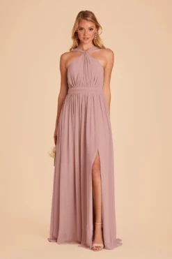 What does every goddess need in order to complete her sleek bridesmaid look? Secret side pockets for stashing her iPhone! This design features a gently ruched high-neck halter silhouette and a sexy slit in the skirt. Kiko in airy chiffon also has built-in bra cups and fits true-to-size.