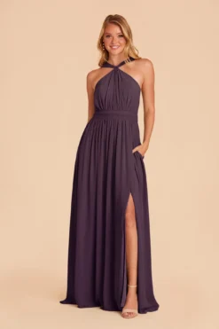What does every goddess need in order to complete her sleek bridesmaid look? Secret side pockets for stashing her iPhone! This design features a gently ruched high-neck halter silhouette and a sexy slit in the skirt. Kiko in airy chiffon also has built-in bra cups and fits true-to-size.