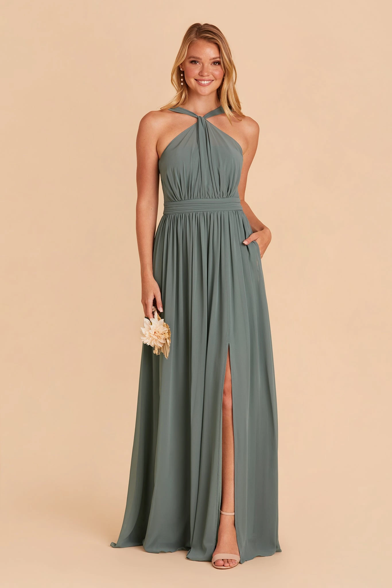 What does every goddess need in order to complete her sleek bridesmaid look? Secret side pockets for stashing her iPhone! This design features a gently ruched high-neck halter silhouette and a sexy slit in the skirt. Kiko in airy chiffon also has built-in bra cups and fits true-to-size.