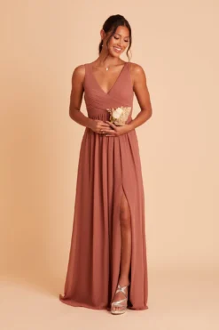 Pretty ✔ Classy ✔ Comfy ✔ This floor-length sleeveless chiffon bridesmaid dress has a raised empire waist which means it’s not only perfect for someone who wants some extra breathing room (while looking long & lean), it also doubles as a maternity bridesmaid dress for expecting moms with a growing baby bump. The bodice features beautiful pleating and because everyone can use a little bit of sex appeal while keeping things classy, we also added a slit for a flash of leg.