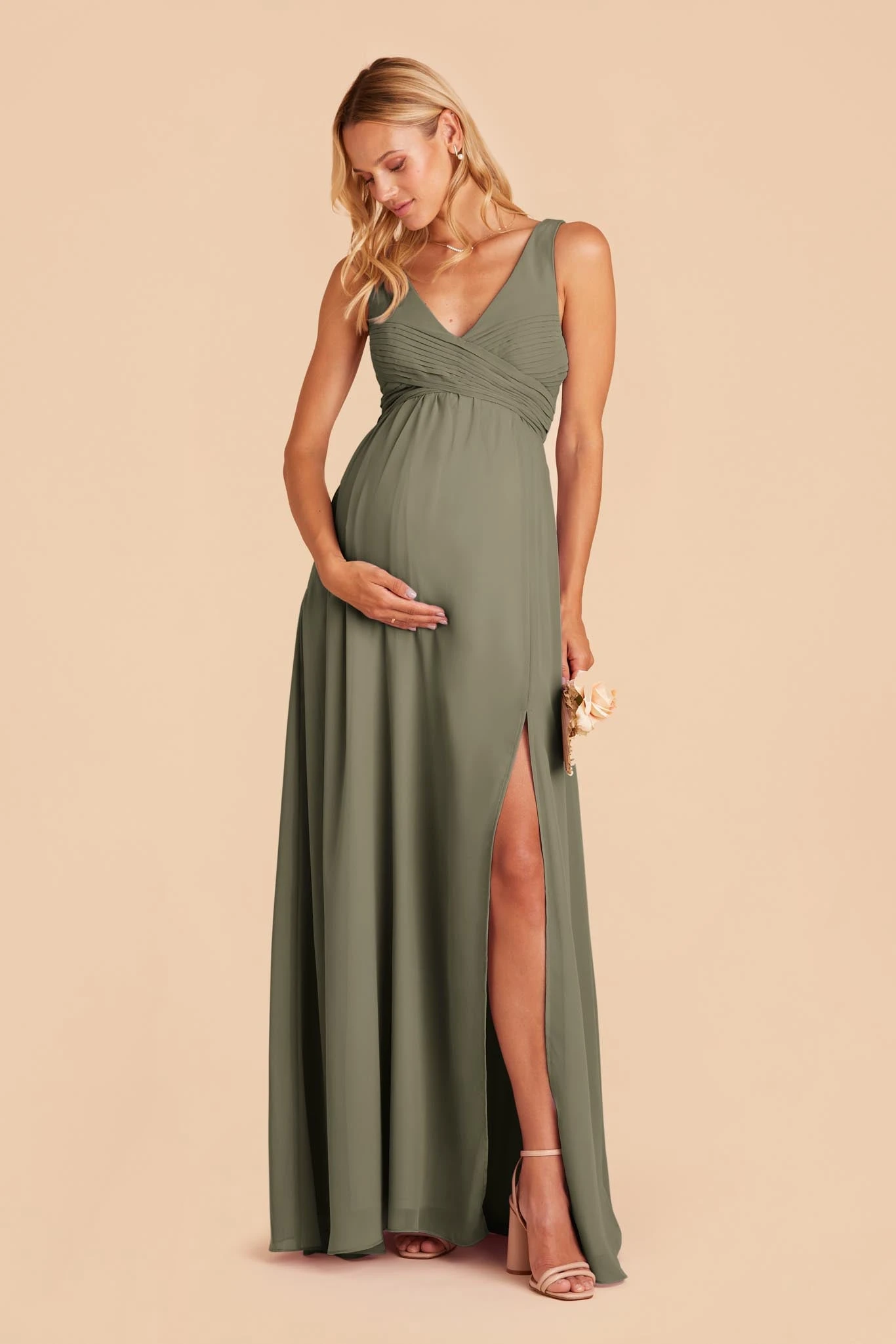 Pretty ✔ Classy ✔ Comfy ✔ This floor-length sleeveless chiffon bridesmaid dress has a raised empire waist which means it’s not only perfect for someone who wants some extra breathing room (while looking long & lean), it also doubles as a maternity bridesmaid dress for expecting moms with a growing baby bump. The bodice features beautiful pleating and because everyone can use a little bit of sex appeal while keeping things classy, we also added a slit for a flash of leg.