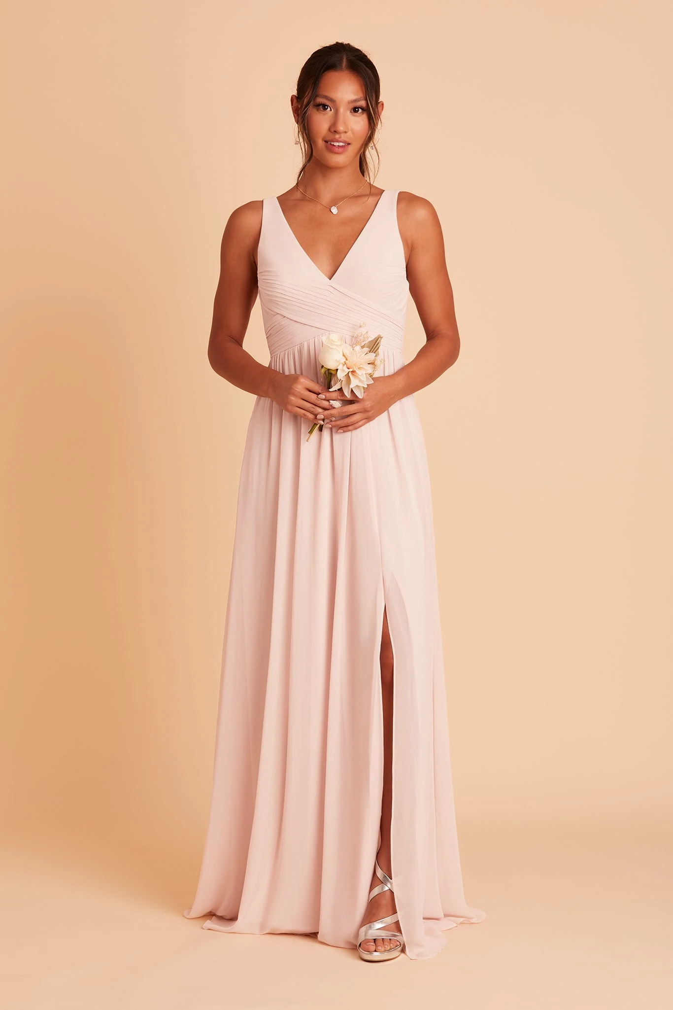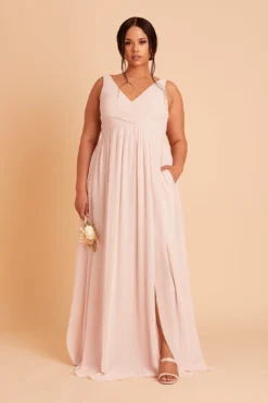 Pretty ✔ Classy ✔ Comfy ✔ This floor-length sleeveless chiffon bridesmaid dress has a raised empire waist which means it’s not only perfect for someone who wants some extra breathing room (while looking long & lean), it also doubles as a maternity bridesmaid dress for expecting moms with a growing baby bump. The bodice features beautiful pleating and because everyone can use a little bit of sex appeal while keeping things classy, we also added a slit for a flash of leg.