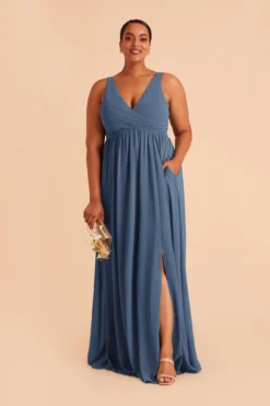 Pretty ✔ Classy ✔ Comfy ✔ This floor-length sleeveless chiffon bridesmaid dress has a raised empire waist which means it’s not only perfect for someone who wants some extra breathing room (while looking long & lean), it also doubles as a maternity bridesmaid dress for expecting moms with a growing baby bump. The bodice features beautiful pleating and because everyone can use a little bit of sex appeal while keeping things classy, we also added a slit for a flash of leg.