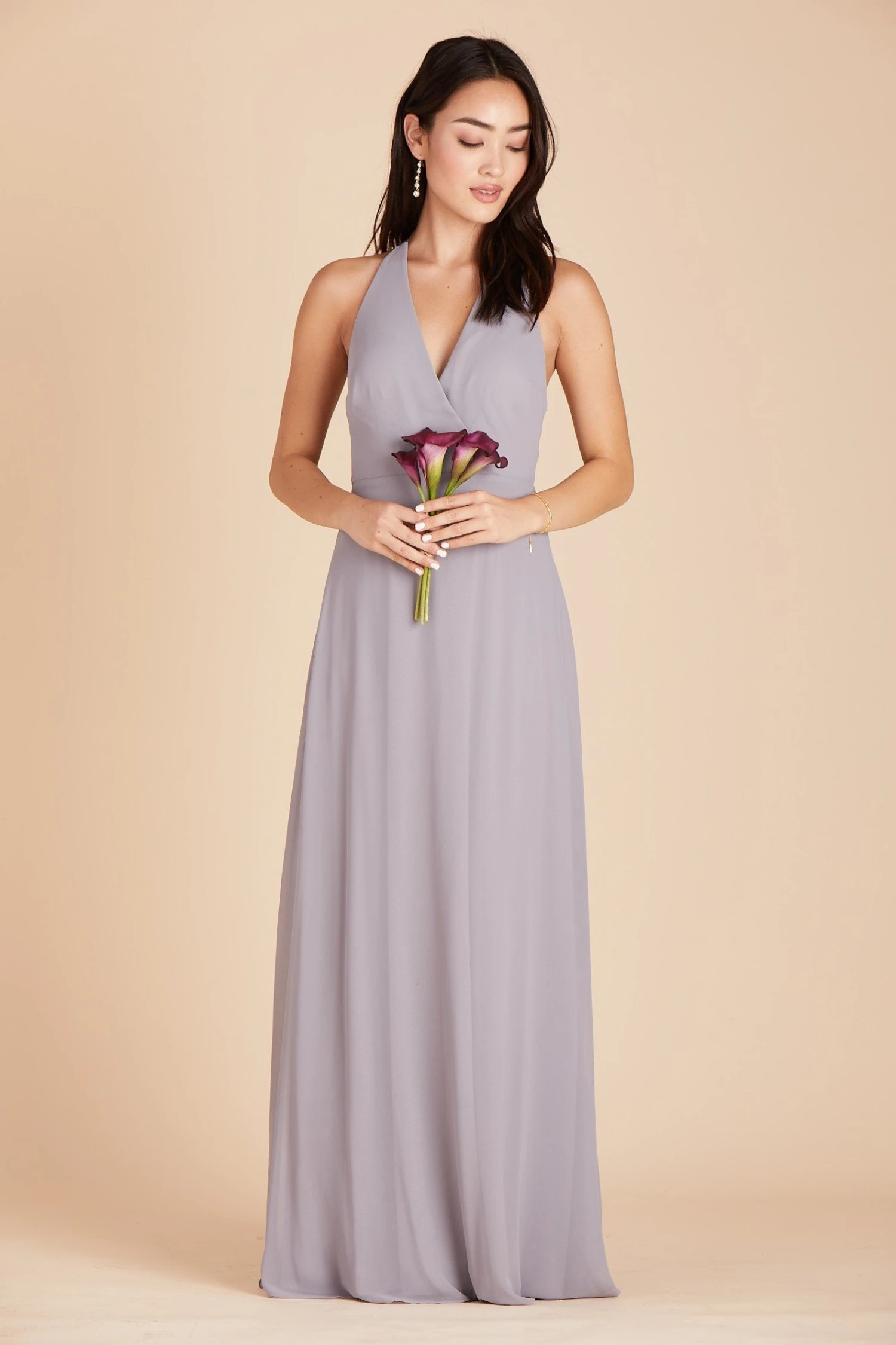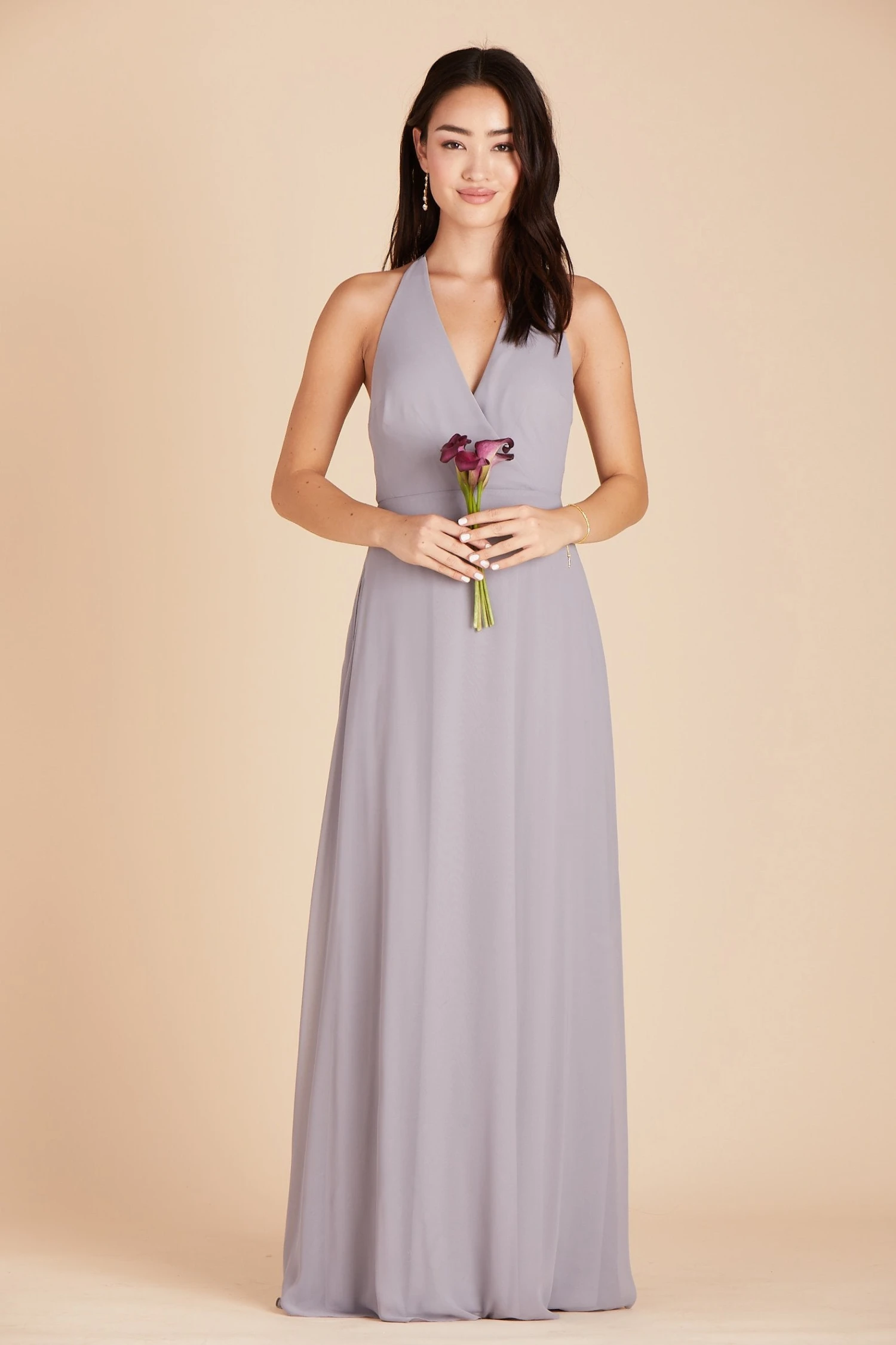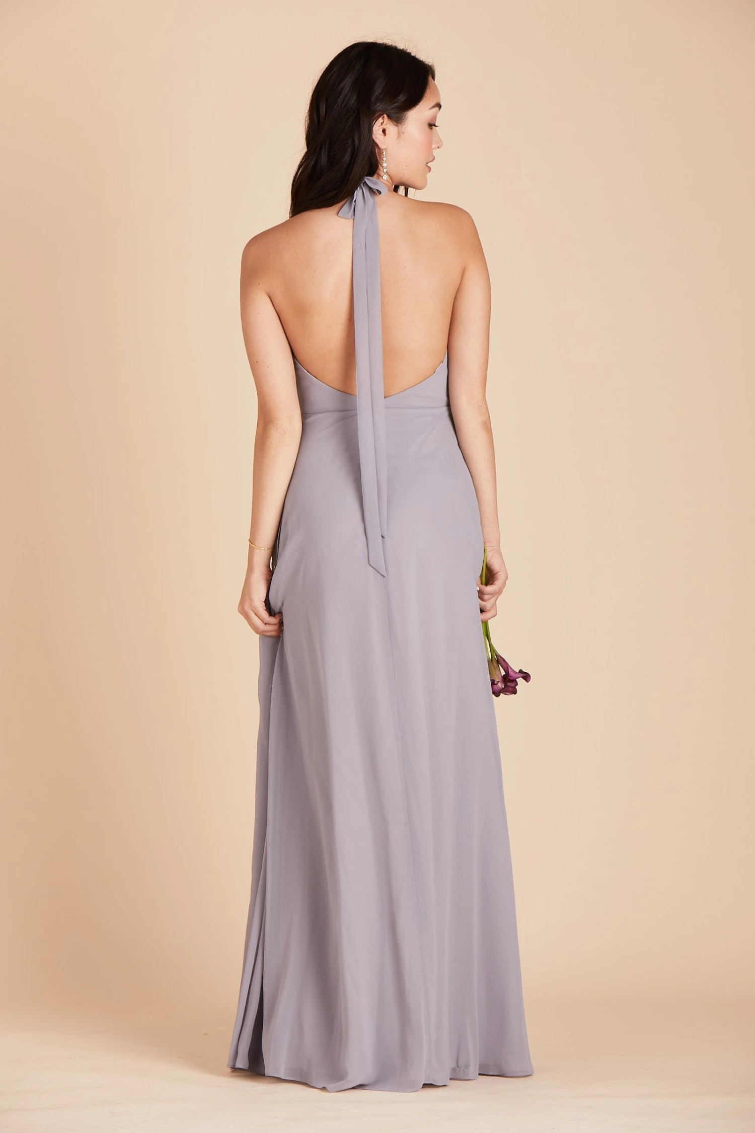 The back is the money shot on our Moni convertible bridesmaid dress, and the front is all class with a plunging halter neckline. Plus we tucked hidden loops at the sides and low back so that you can tie the straps multiple ways: mirror the front and create a plunging V line in the back, tie a sweet bow at the nape of your neck, or create a sexy triangle.