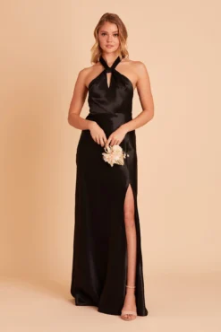 Your wedding will look like a star-studded event with your bridal party wearing this twist-front halter satin bridesmaid dress. The lustrous fabric of this floor-length gown makes each color look rich and regal while the halter style creates an alluring look that’s on par with an A-list Hollywood star. We love this bridesmaid dress paired with a low bun that softens the cool, modern style while showing off the neckline.