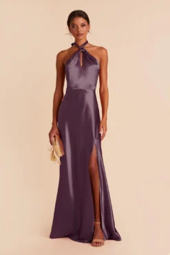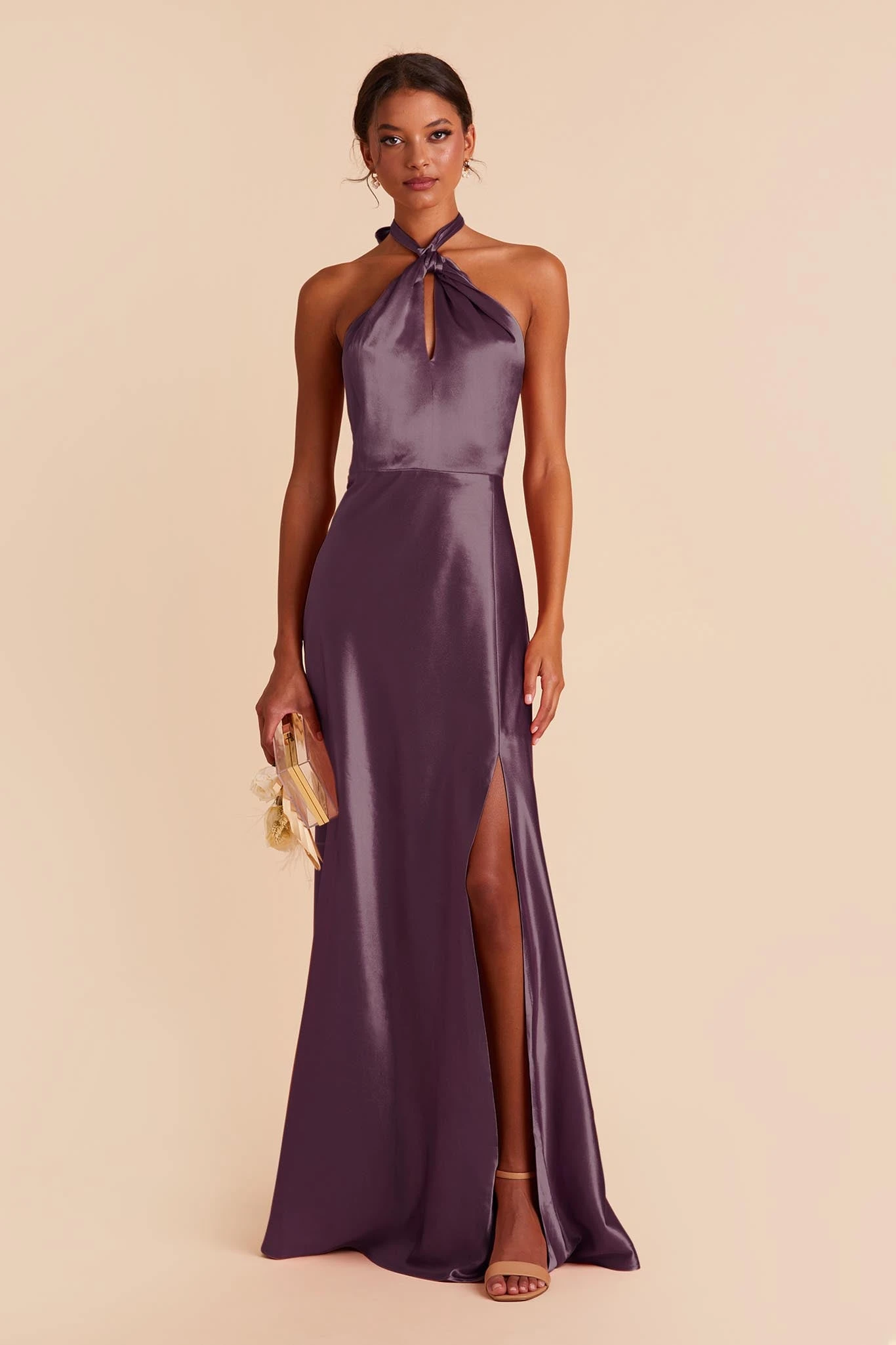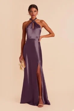 Your wedding will look like a star-studded event with your bridal party wearing this twist-front halter satin bridesmaid dress. The lustrous fabric of this floor-length gown makes each color look rich and regal while the halter style creates an alluring look that’s on par with an A-list Hollywood star. We love this bridesmaid dress paired with a low bun that softens the cool, modern style while showing off the neckline.