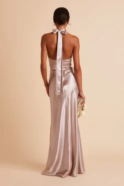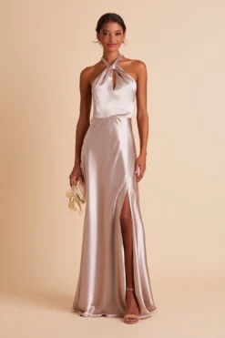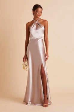 Your wedding will look like a star-studded event with your bridal party wearing this twist-front halter satin bridesmaid dress. The lustrous fabric of this floor-length gown makes each color look rich and regal while the halter style creates an alluring look that’s on par with an A-list Hollywood star. We love this bridesmaid dress paired with a low bun that softens the cool, modern style while showing off the neckline.