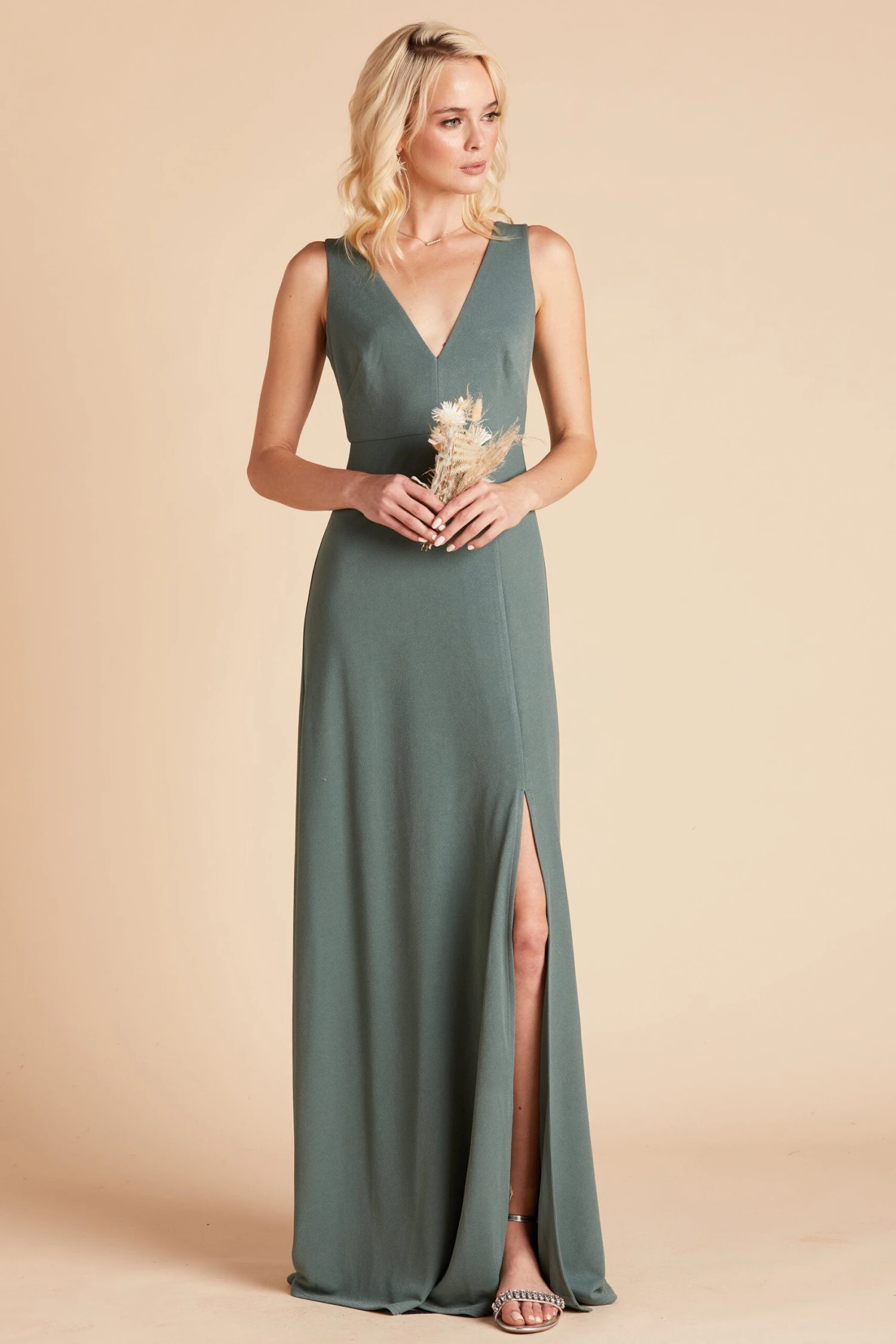 Sleek, modern and minimal is our Shamin bridesmaid dress, featuring a plunging V neckline and body-skimming fit. She’s designed in a comfy stretch knit crepe with a sexy front slit to show off a flash of skin. We can’t say this about all bridesmaid dresses, but she’s one you can definitely rock again long after the wedding.