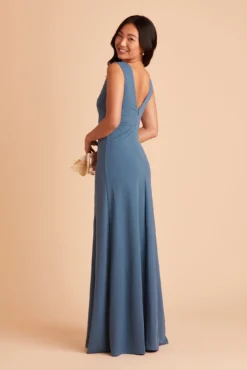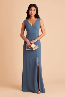 Sleek, modern and minimal is our Shamin bridesmaid dress, featuring a plunging V neckline and body-skimming fit. She’s designed in a comfy stretch knit crepe with a sexy front slit to show off a flash of skin. We can’t say this about all bridesmaid dresses, but she’s one you can definitely rock again long after the wedding.