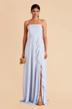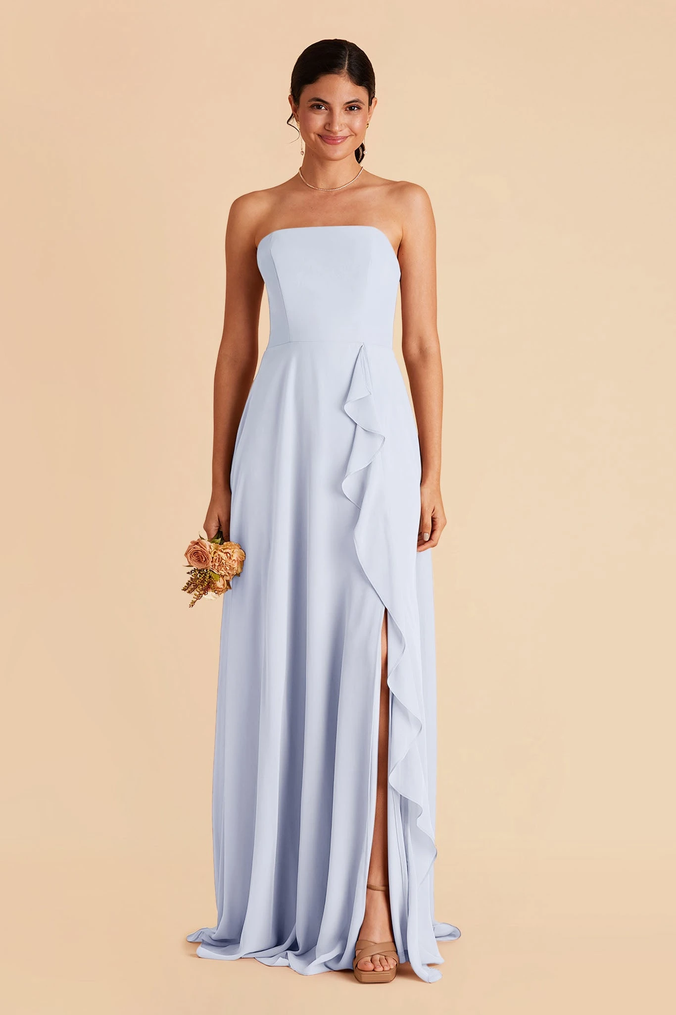 Winnie is like a mashup of our Chris convertible dress and our Theresa ruffle dress. She has a straight neckline, removable spaghetti straps, and a flowy, romantic ruffle skirt. We love this gown with a pretty pearl necklace.