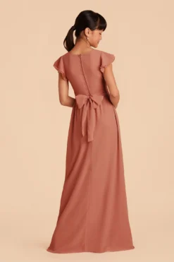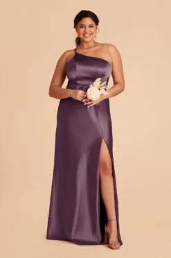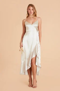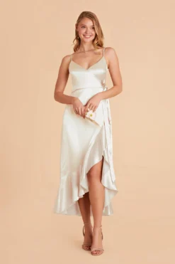This faux-wrap satin bridesmaid dress is business on the top and princess on the bottom.